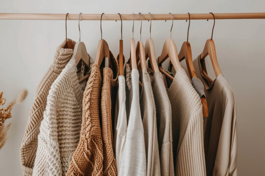 Cozy neutrals: trendy knit and casual sweaters on wooden hangers displayed in a minimalist closet