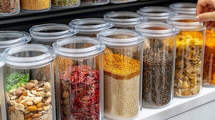 Organized kitchen pantry with wooden shelves full of glass jars containing various grains and seeds. Zero-waste food storage concept.