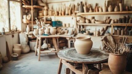 An organized pottery studio with spinning wheels and clay sculptures, Artisan tools arranged in a creative workshop, Contemporary pottery style