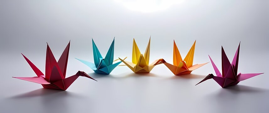 Brightly colored paper origami cranes arranged in symmetrical pattern on white background