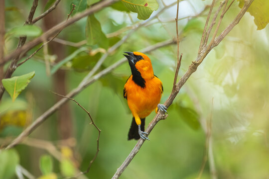 Altamira Oriole Icterus gularis, Large bright orange oriole with thick dark bill, found in open shrubby woodland.