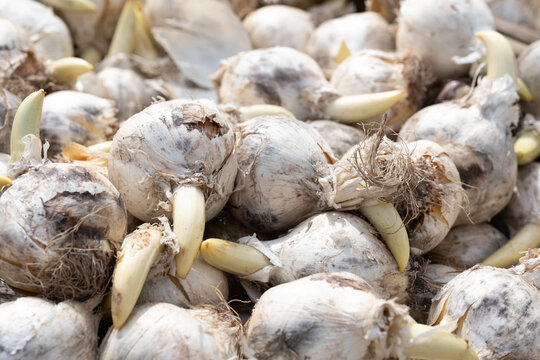 Close up of Allium (ornamental onion) flower bulbs in a garden center. Narrow depth of field