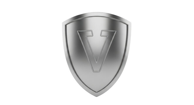 Isolated shield symbol, silver-tone heraldic badge with letter V, vector emblem design asset