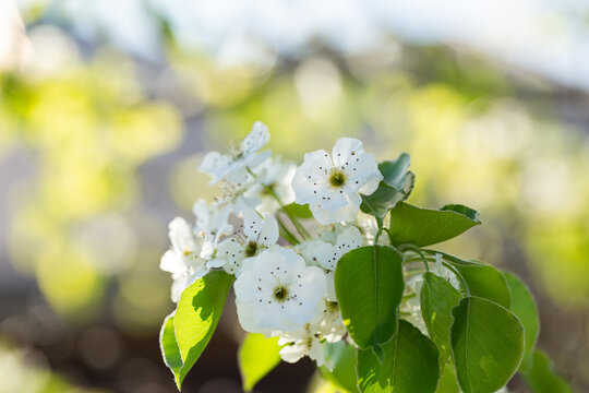 White spring blossom on ornamental tree with green fresh leaves growing and bokeh background