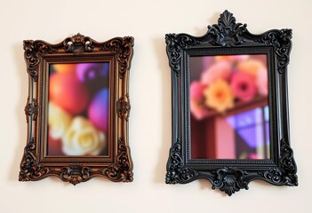 Two antique ornate picture frames, brown and dark gray, on a wall,  stylish, retro frames