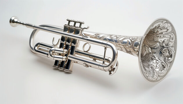 Silver trumpet with ornate designs on the bell musical instrument close-up elegant and detailed craftsmanship