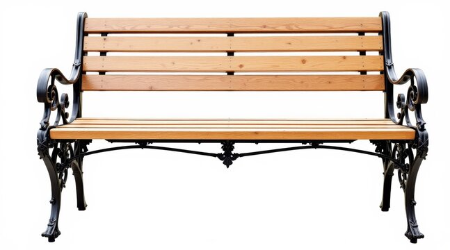 Elegant Wooden Garden Bench with Ornate Black Metal Frame on White Background