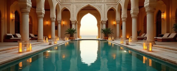 Glowing palatial corridor with arches and chandeliers in stunning symmetry