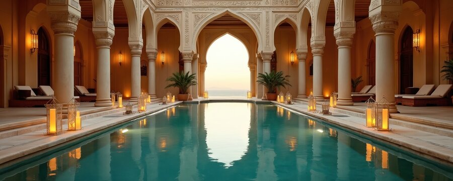 Opulent palatial dining hall with arched columns and chandeliers, fine dining ambience