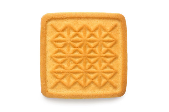 Square shortbread cookies with a pattern on a white background. One close-up cookie with a shadow.
