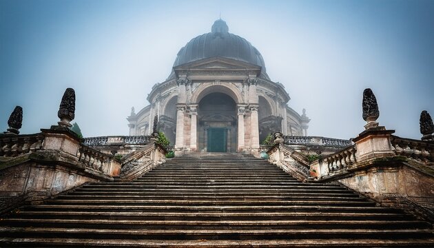 ornate ancient dome building stone steps foggy day