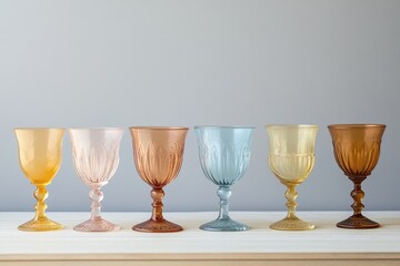 Ornate wine goblets arranged on a celebratory dining surface. Elegant crystal stemware for refined celebrations. Collection of crystal glassware.