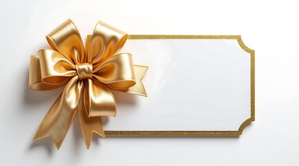 Golden bow on a white rectangular gift tag with gold border ribbon