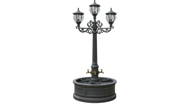 A symmetrical composition featuring an ornate black lamppost flanked by two identical benches, isolated against a white backdrop