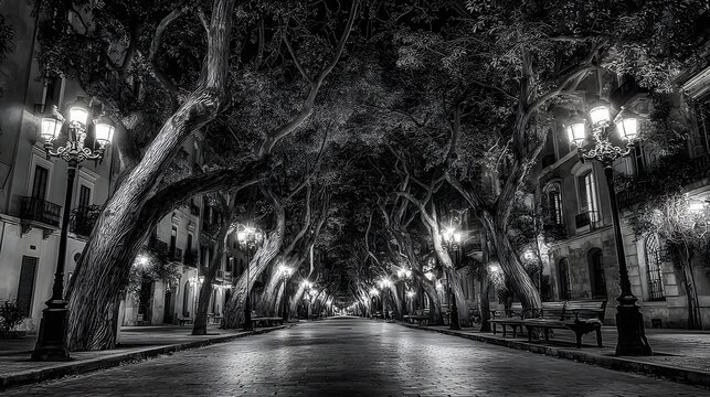 Illuminated sugar skulls rest on a cobblestone street at night, with a grand building in the background.  A festive, atmospheric scene.