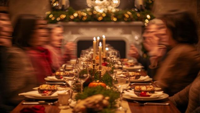 Gathering around candlelit holiday table with pumpkin centerpiece and garland