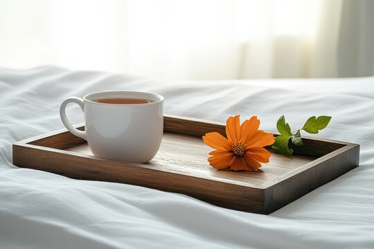 An ornate wooden tray on the bed holds a tea mug and a flower