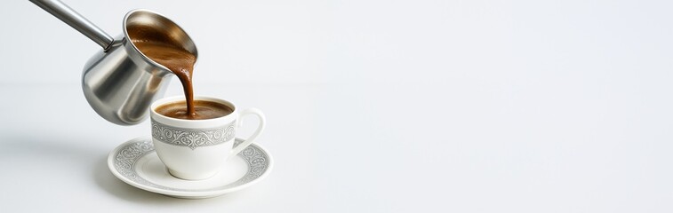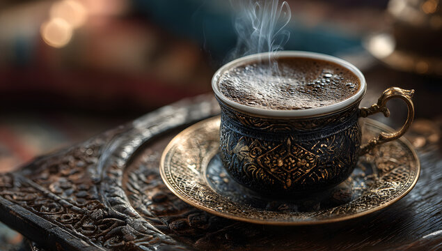 Hot coffee in an ornate cup with steam rising against a blurred background