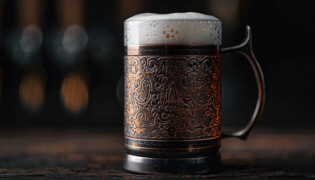 Vintage metal beer mug filled with frothy beer, showcasing intricate engravings, perfect for bar decor or brewery promotion.