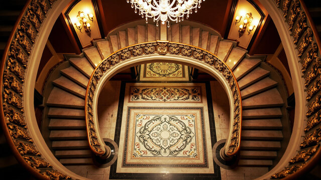 Dramatic Staircase in Dark Mansion with Light, A Gothic Stairwell with Stone Balustrade, Lit with Sunbeams