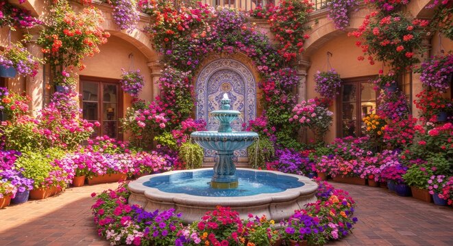 Sunlit mediterranean courtyard featuring tiered stone fountain under colonnade and pergola