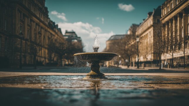 Ornate stone fountain with flowing water in a tranquil garden setting
