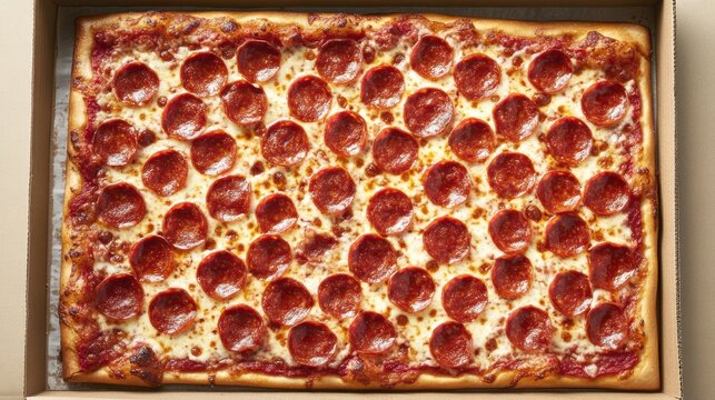 Freshly baked pepperoni pizza delicious italian food rectangular pizza in delivery box