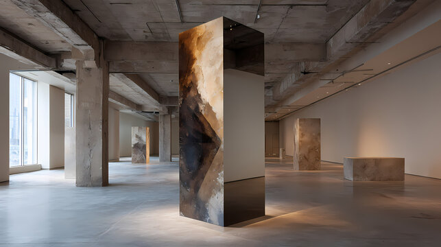 art direction for sculptural exhibition | structured silence | analytical tension | sandstone beige and oxide red | orthogonal stacking | suspended slabs | mirror plane distortion | spatial inversion
