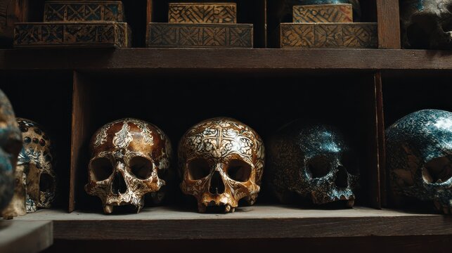 painted skulls displayed within an ossuary also known as a charnel house or beinhaus showcase intricate artwork on the skulls creating a unique and thought provoking atmosphere