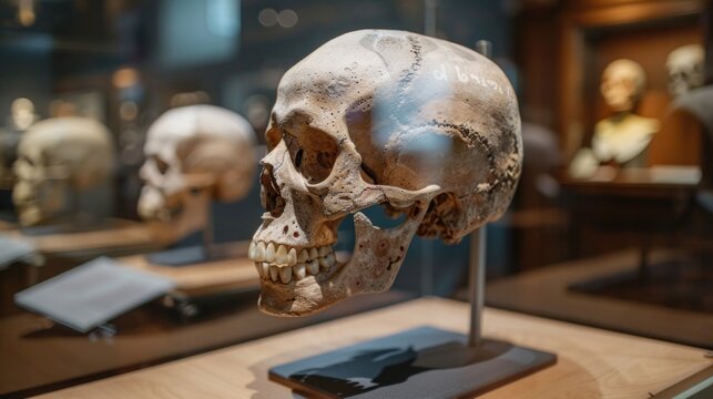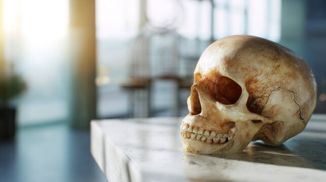 Exploring the mysteries of the human skull in a modern bright room with natural light