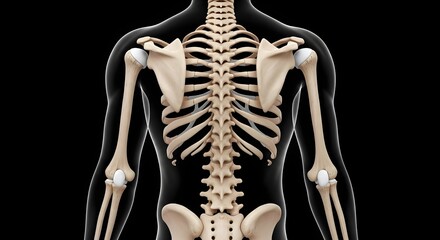 Detailed Rear View of Human Skeleton Illustrating Spine, Rib Cage, and Shoulder Blades on Black Background for Medical and Educational Contexts