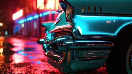 The front grill of a vintage car its neon headlights casting an otherworldly glow onto the ground