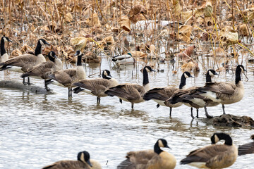 Geese in a row on driftwood