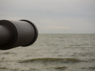 Muzzle of a steel cannon barrel looks out over  gray, endless seeming sea lying in the blurred area. Symbolic image. Represents the necessary willingness to defend ourselves from the distant unknown.