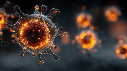 A detailed digital representation of a virus particle, showcasing its structure with glowing elements against a dark background.