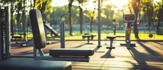 exercise machines are set at open air gym in stadium. Park, outdoor, public or street gym