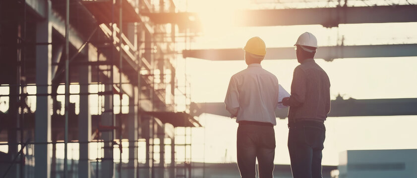 Silhouettes of two construction workers at dusk, overseeing a site with beams of sunlight piercing through the scaffold