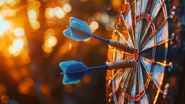 side view of darts board at sunset blue arrows in it background on outdoor games