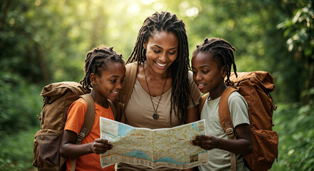 Smiling black african american single mother and her two children wearing backpacks and exploring a lush tropical forest while traveling on vacation together, looking at map while hiking