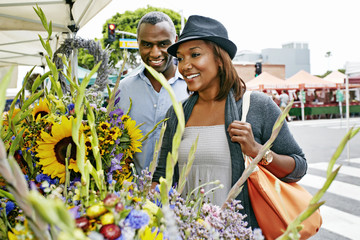 Black couple shopping at outdoor market