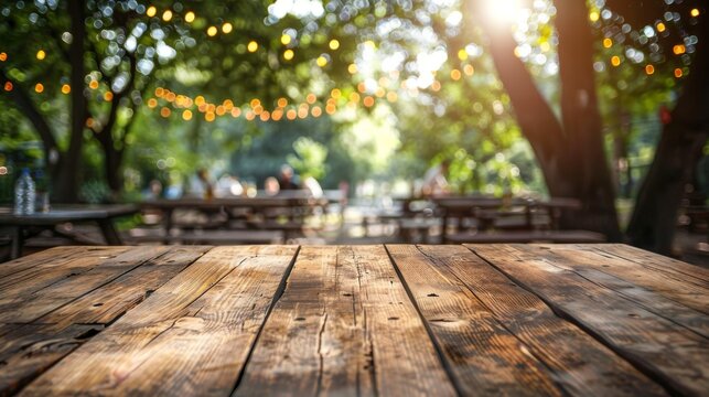 A rustic wooden tabletop with a blurred background of a summer backyard scene