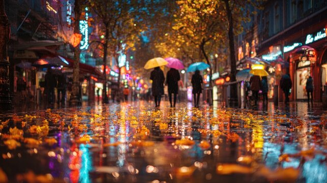 Rainy Day Stroll: A mesmerizing view of the city during a rain shower, pedestrians stroll under umbrellas down a wet street, the lights of the shops and buildings reflecting on the pavement.