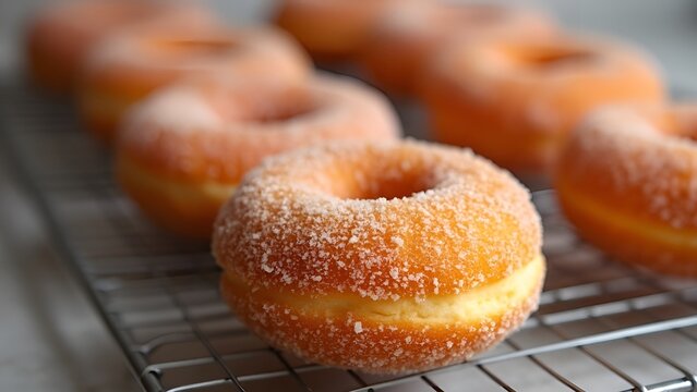 Sugary, golden doughnuts cooling on a metal rack, with a crisp outer layer and fluffy interior, perfect for a sweet breakfast treat