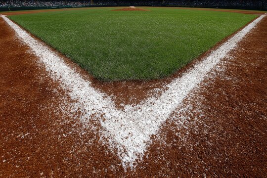 Close-up of a baseball infield, showing the white baseline separating the dirt infield from the green outfield grass