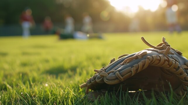 Golden baseball glove catching a ball, with a victorious pitcher in the background, and a full stadium cheering