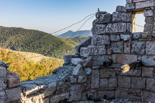Old military dilapidated fortress on the background of a mountain pass in autumn. blurry focus