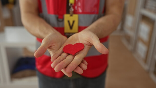 Man in volunteer vest holding a red heart with open hands in building volunteer center; community support kindness.
