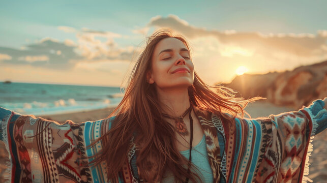 Young woman wearing colorful poncho relaxing in beautiful nature with opened arms. Spirituality, harmony and connection with nature concept.