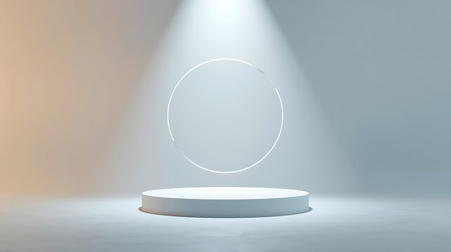 Empty stage spotlight casting dramatic circular beam on concrete floor in dark studio