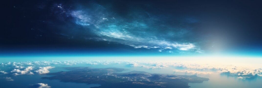 Abstract view of Earth from space with orange light rising over the horizon, symbolizing new beginnings and hope for global unity in a futuristic cosmic scene